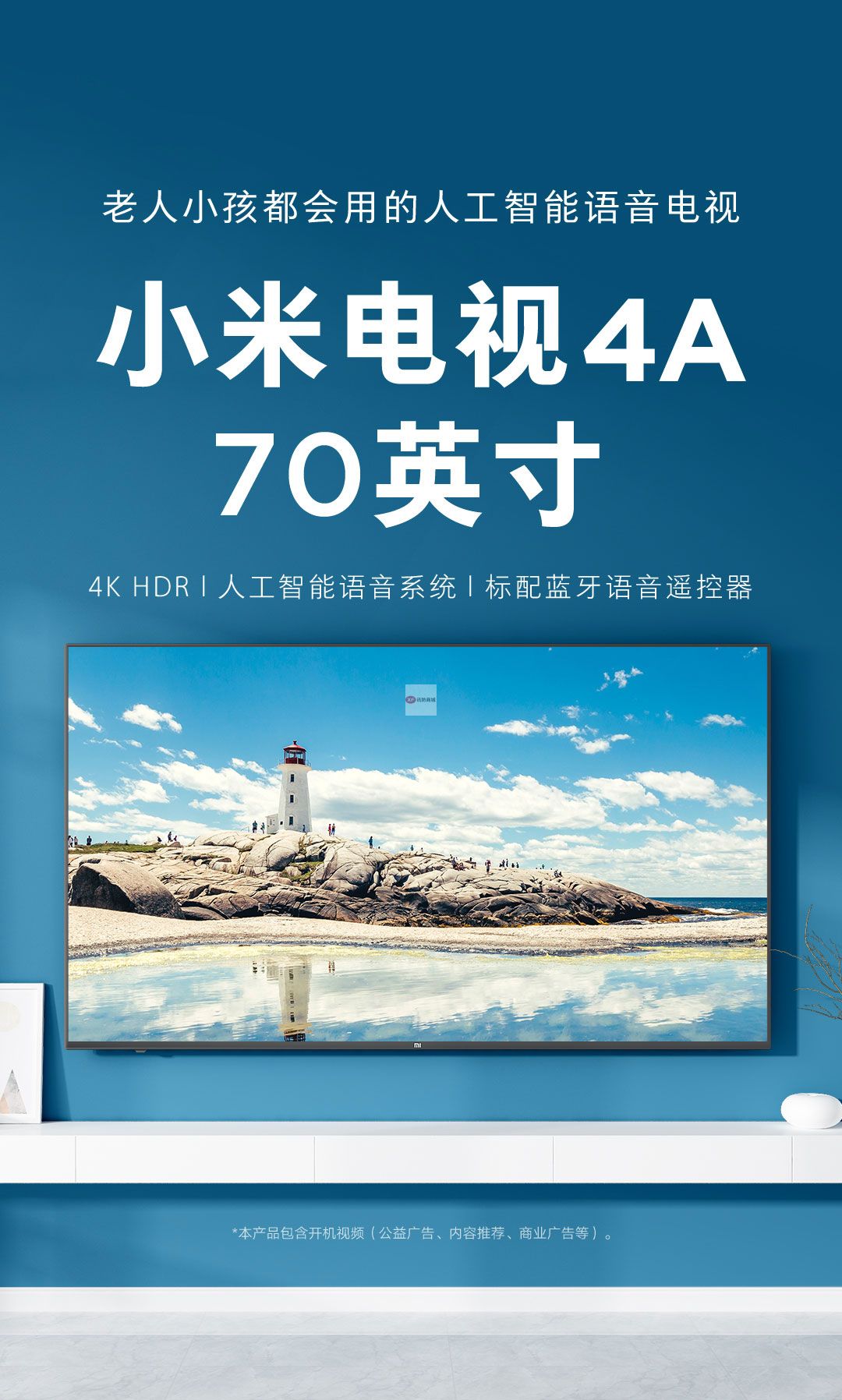 商品名稱:小米電視4A 70英寸 4K超高清 HDR 二級(jí)能效 2GB+16GB L70M5-4A 內(nèi)置小愛 智能網(wǎng)絡(luò)液晶平板教育電視