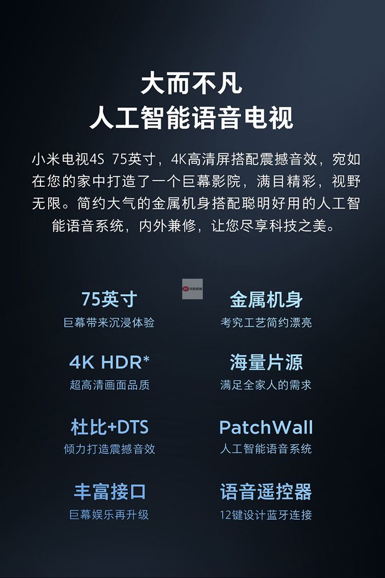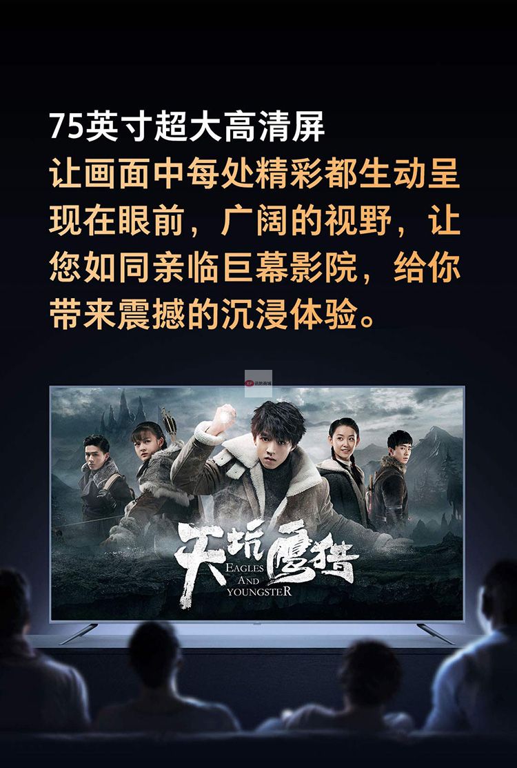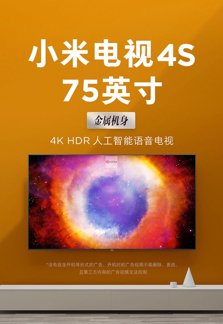 商品名稱:小米電視4S 75英寸超大屏 4K超高清藍(lán)牙語(yǔ)音遙控 2GB+8GB L75M5-4S 人工智能語(yǔ)音網(wǎng)絡(luò)液晶平板教育電視 含掛架及普通安裝