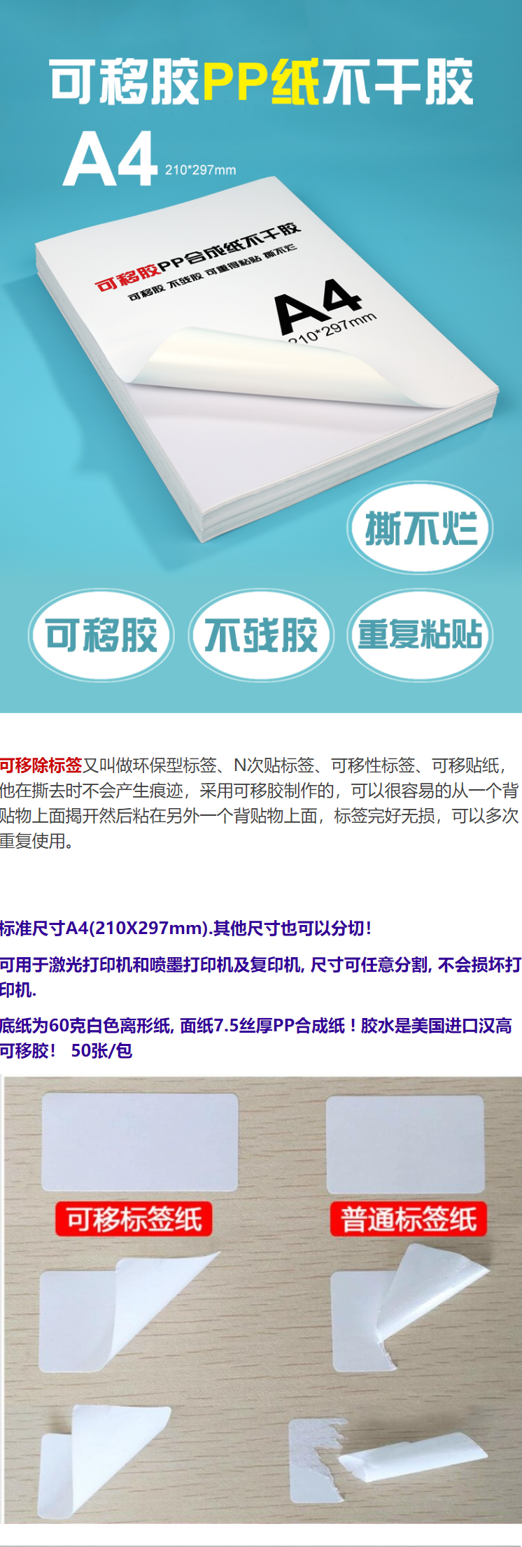 商品名稱(chēng):A4 亮光 不干膠標(biāo)簽打印紙覆膜背膠粘貼紙 噴墨防水撕不爛耐高溫PET 50張