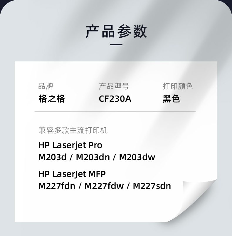 商品名稱:格之格CF230A粉盒大容量雙支裝不含芯片適用惠普M203dn M203dw M227fdn M227fdw打印機硒鼓