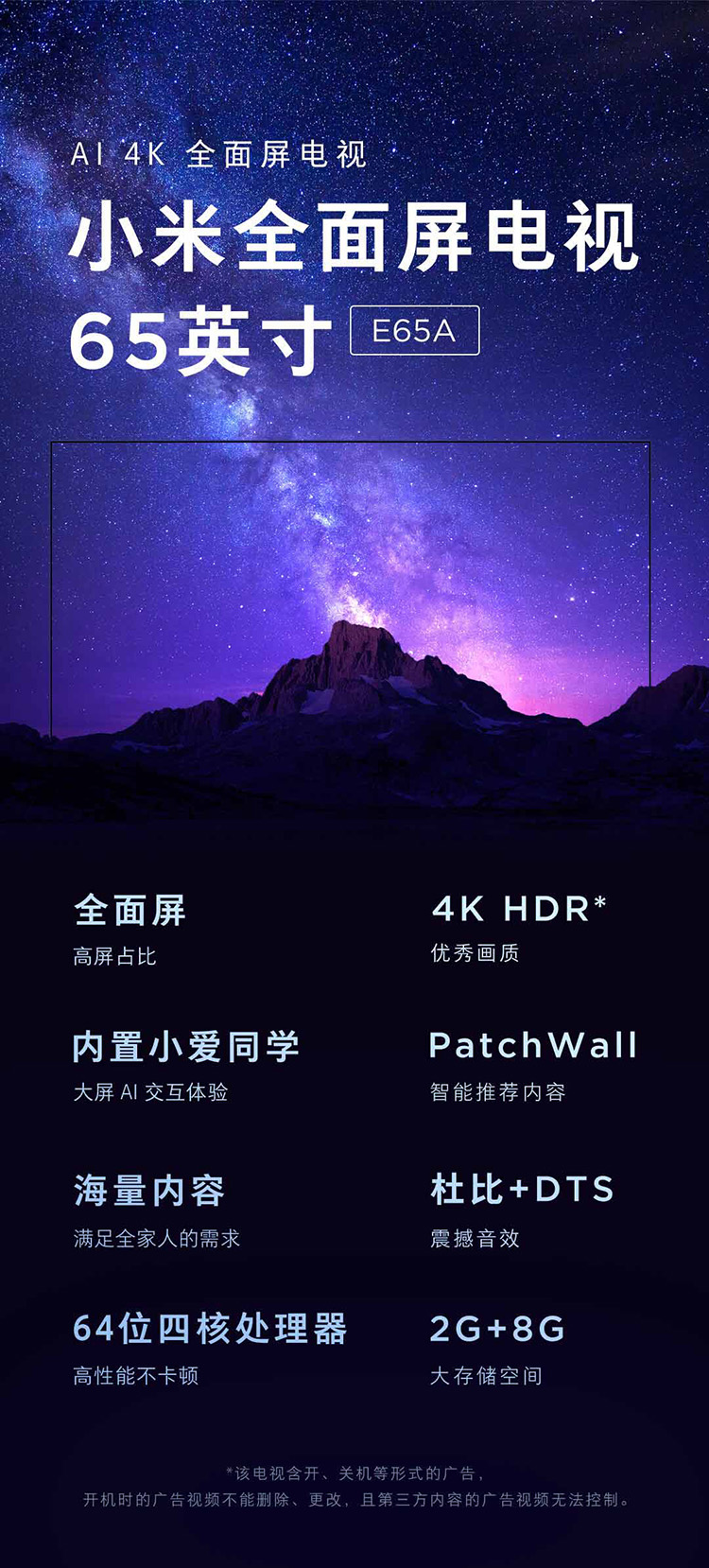 商品名稱(chēng):小米(MI) L65M5-EA 全面屏電視E65A 65英寸 4K超高清 HDR 內(nèi)置小愛(ài) 藍(lán)牙語(yǔ)音 2GB 8GB AI人工智能網(wǎng)絡(luò)液晶平板電視L65M5-EA (65英寸 小米電視E65A)