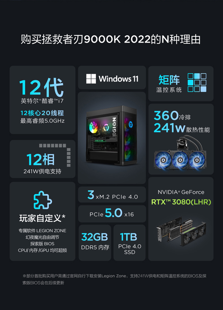 商品名稱:聯(lián)想(Lenovo)拯救者刃9000K 2022游戲電腦主機(jī)(12代酷睿i7-12700KF RTX3080 10GB LHR顯卡32G DDR5 側(cè)透 )