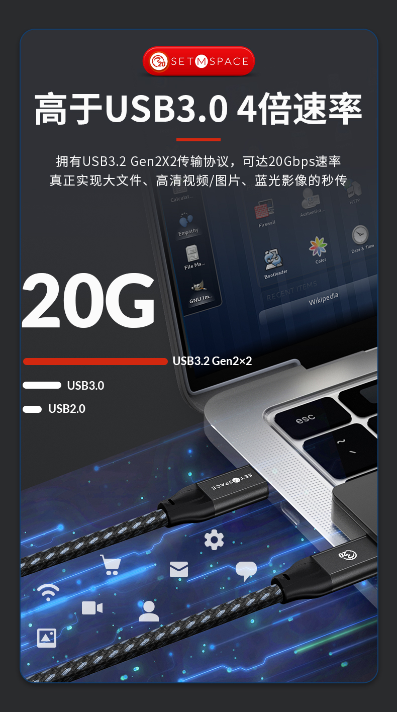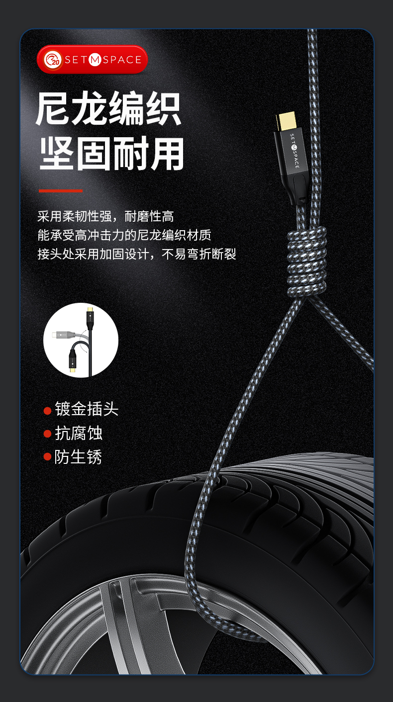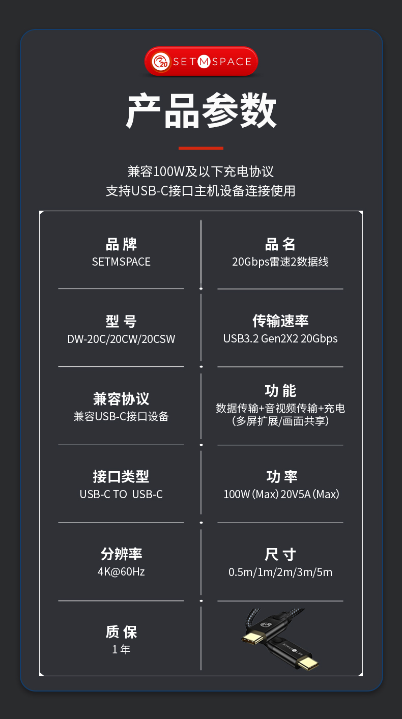商品名稱(chēng):SETMSPACE (合金桌面)USB3.2Gen2*2全功能type-c數(shù)據(jù)線顯示器視頻連接線快充 20Gbps USB3.2 C直-C直 線長(zhǎng)0.5m