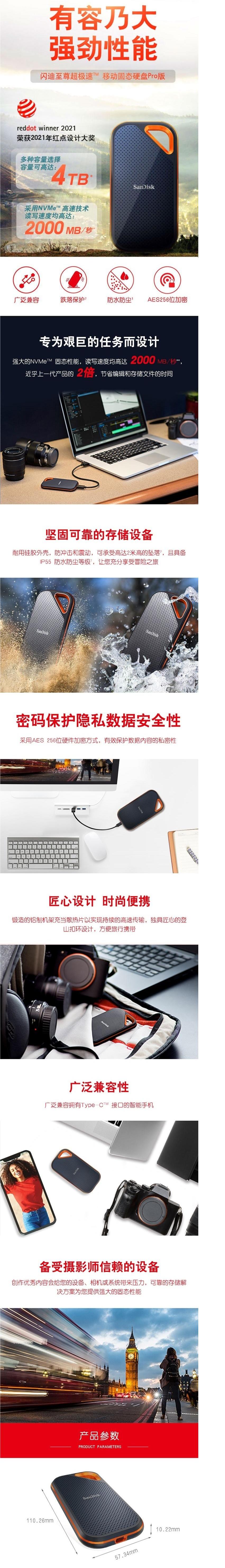 商品名稱:閃迪(SanDisk)2TB Nvme移動硬盤(PSSD)E81至尊超極速Pro升級版 高速傳輸2000MB/秒 IP55等級三防保護