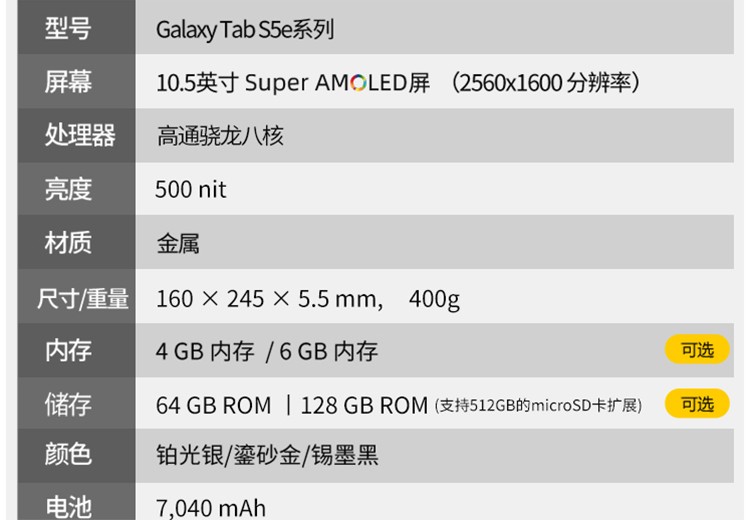 商品名稱(chēng):三星(SAMSUNG) Tab S5e 平板電腦 10.5英寸 6+128G(4G通話(huà)版)