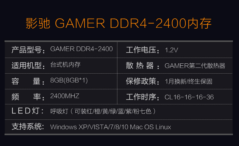 商品名稱(chēng):影馳 GAMER DDR4 2400 8G 臺(tái)式機(jī)內(nèi)存 內(nèi)存條 燈條 呼吸燈 燈光內(nèi)存